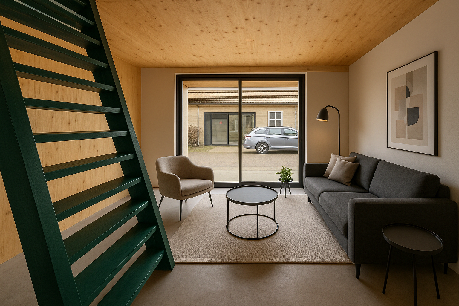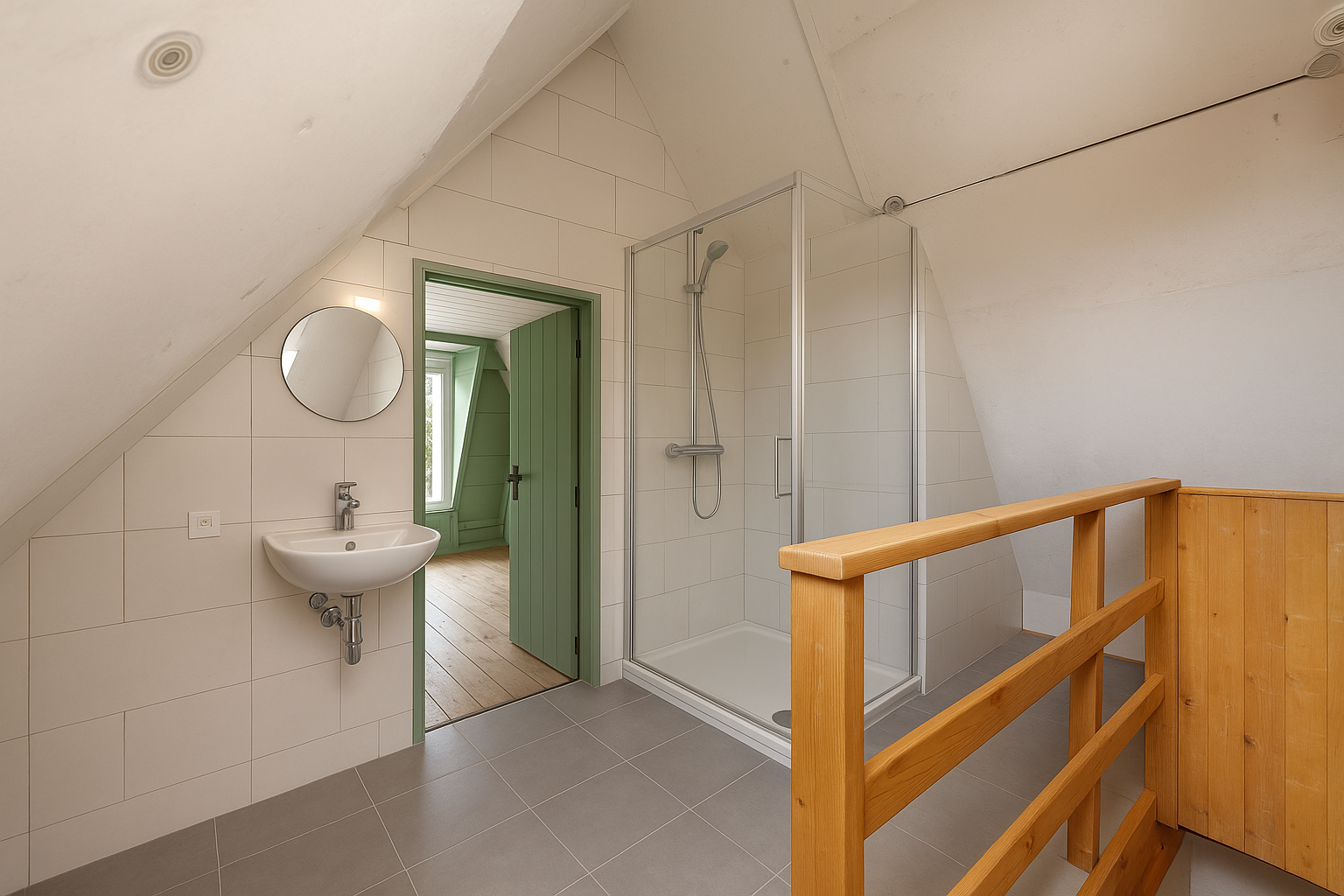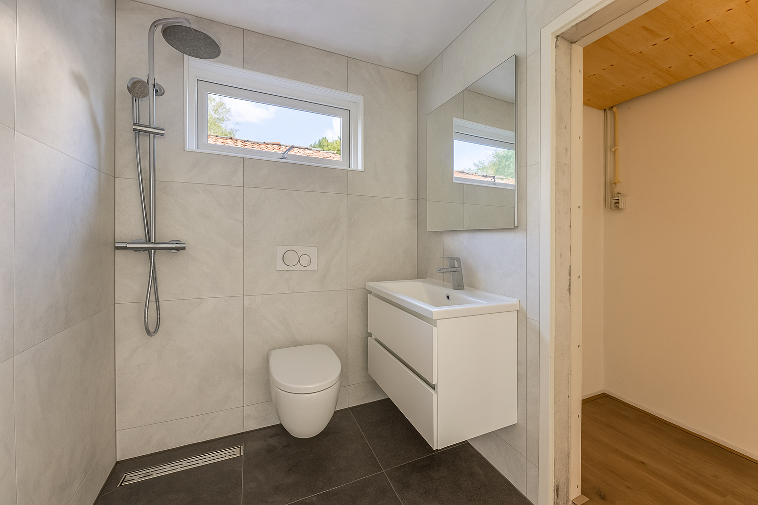 Met een vaste trap kom je op de bovenverdieping, waar je twee slaapkamers kunt creëren of een slaapkamer met een badkamer.