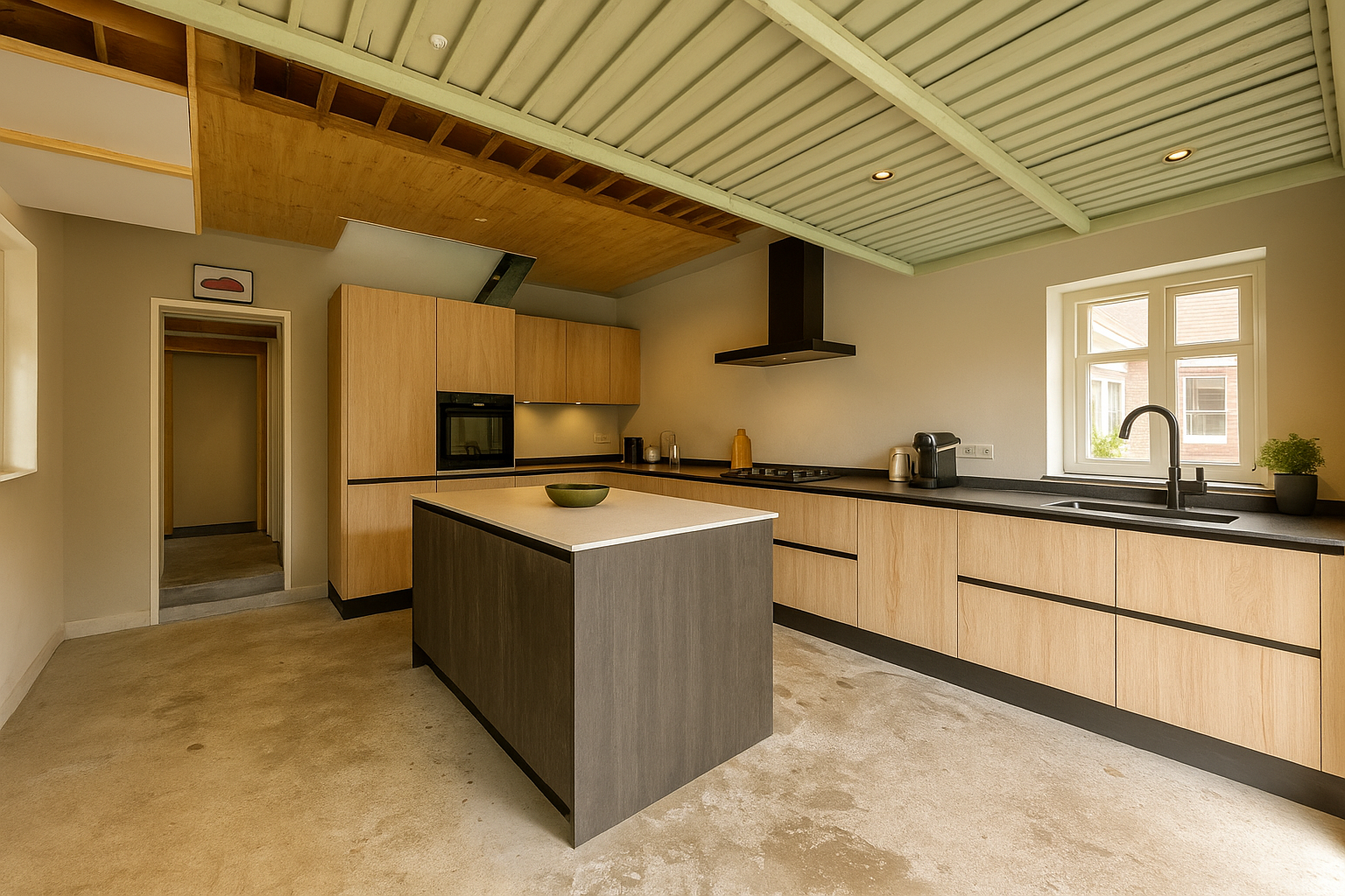 En dan kom je in de woonkeuken, met een doorloop naar het zitgedeelte. Hoe gezellig is dat!