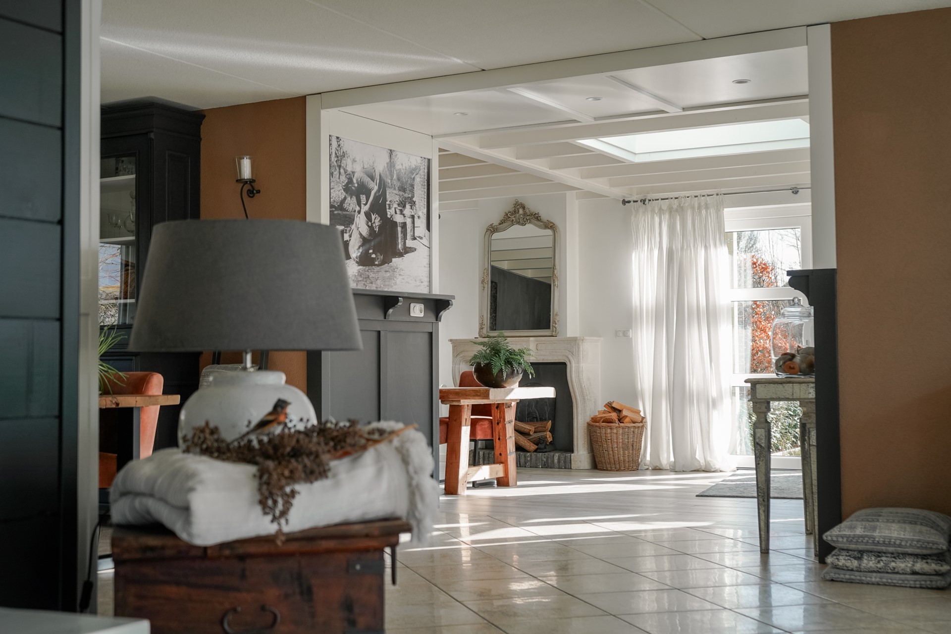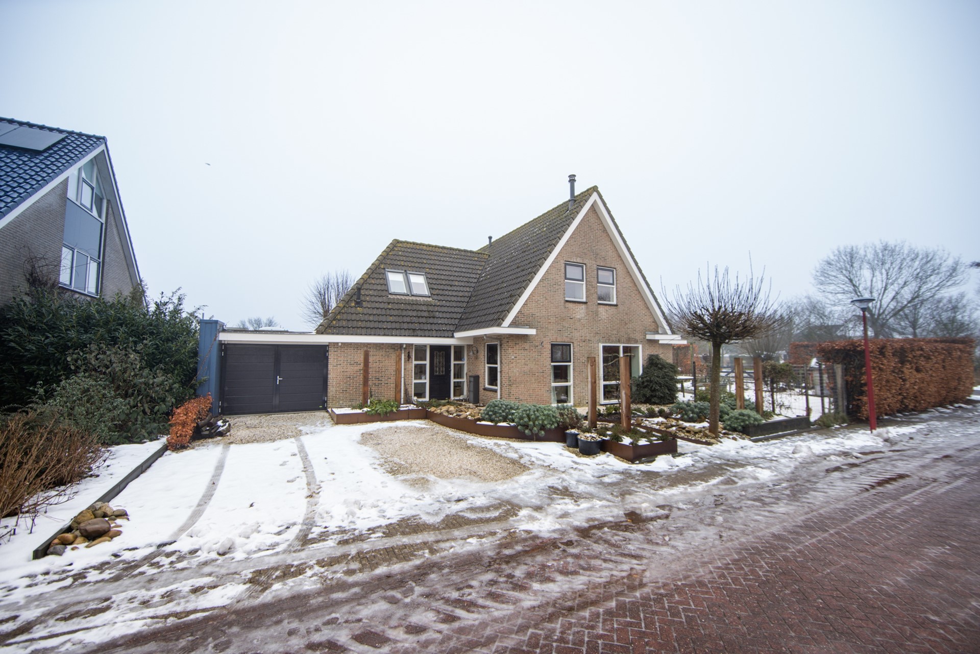 Via tuin met oprit naar de garage kom je bij de entree van de woning. De zeer ruime hal met garderobe en toilet biedt toegang tot de bijkeuken, de inpandige berging en de nieuw aangebouwde, geïsoleerde en verwarmde garage. De Z-vormige woonkamer heeft twee openslaande deuren naar de tuin. De gezellige halfopen woonkeuken met inbouwapparatuur heeft een landelijke stijl en eveneens openslaande deuren naar de tuin. In het zitgedeelte zorgt een prachtige Jotul-houtkachel voor sfeer. En de extra woon-/werkkamer biedt een prachtig uitzicht. De gehele begane grond is voorzien van vloerverwarming.