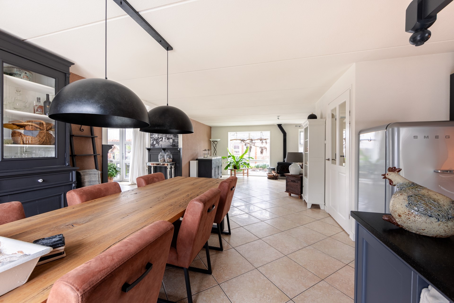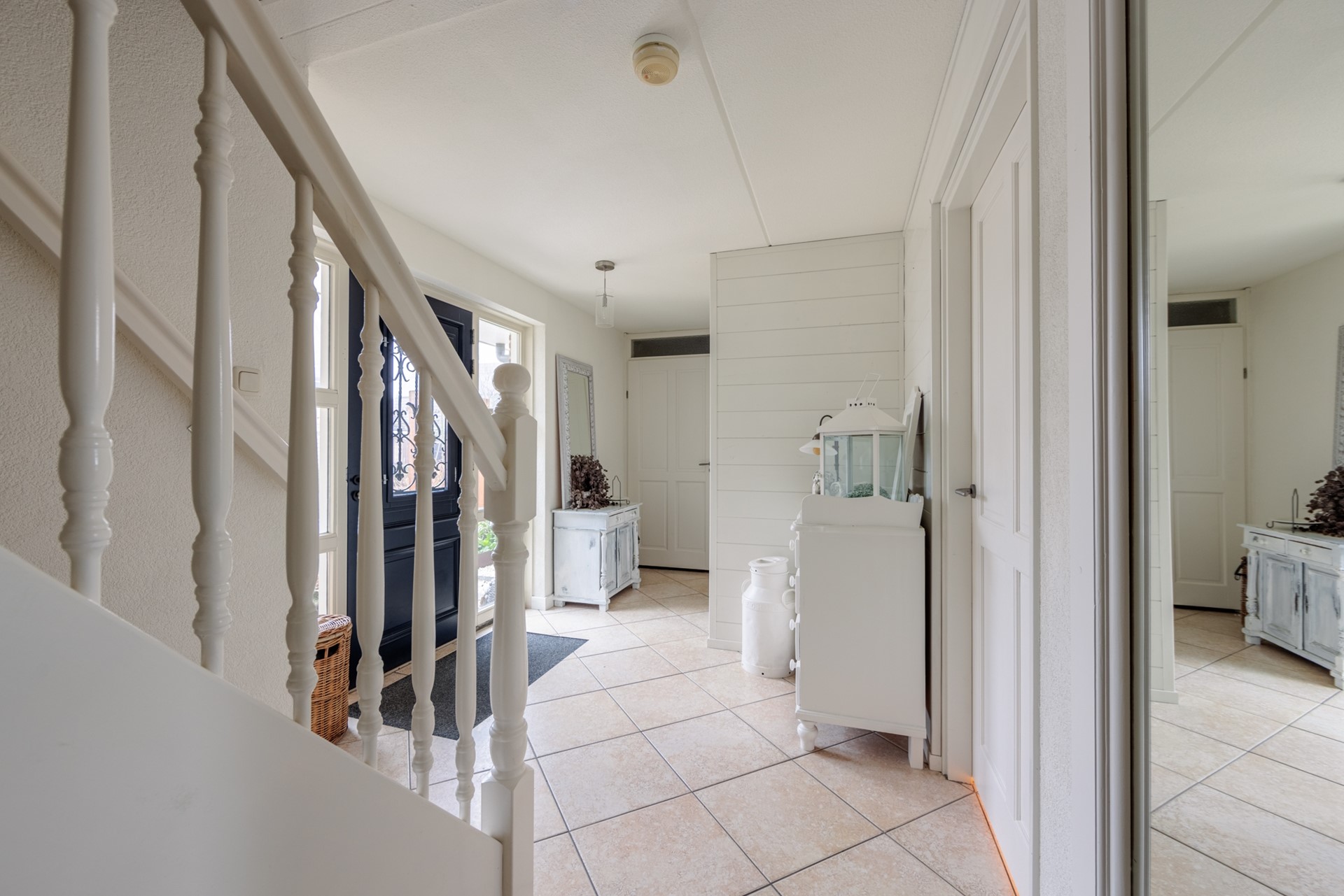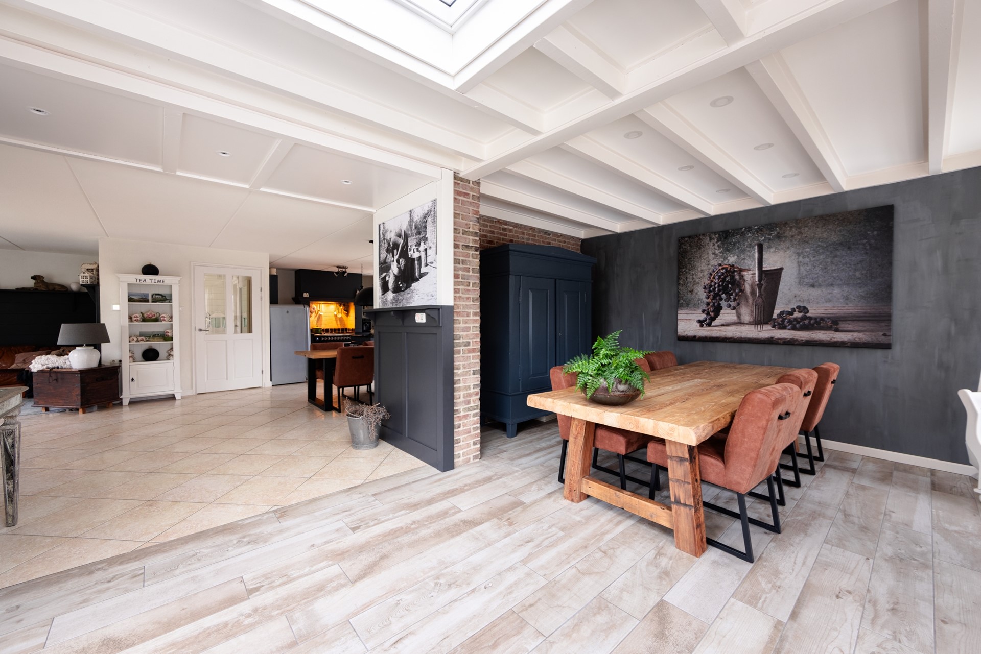 Via tuin met oprit naar de garage kom je bij de entree van de woning. De zeer ruime hal met garderobe en toilet biedt toegang tot de bijkeuken, de inpandige berging en de nieuw aangebouwde, geïsoleerde en verwarmde garage. De Z-vormige woonkamer heeft twee openslaande deuren naar de tuin. De gezellige halfopen woonkeuken met inbouwapparatuur heeft een landelijke stijl en eveneens openslaande deuren naar de tuin. In het zitgedeelte zorgt een prachtige Jotul-houtkachel voor sfeer. En de extra woon-/werkkamer biedt een prachtig uitzicht. De gehele begane grond is voorzien van vloerverwarming.