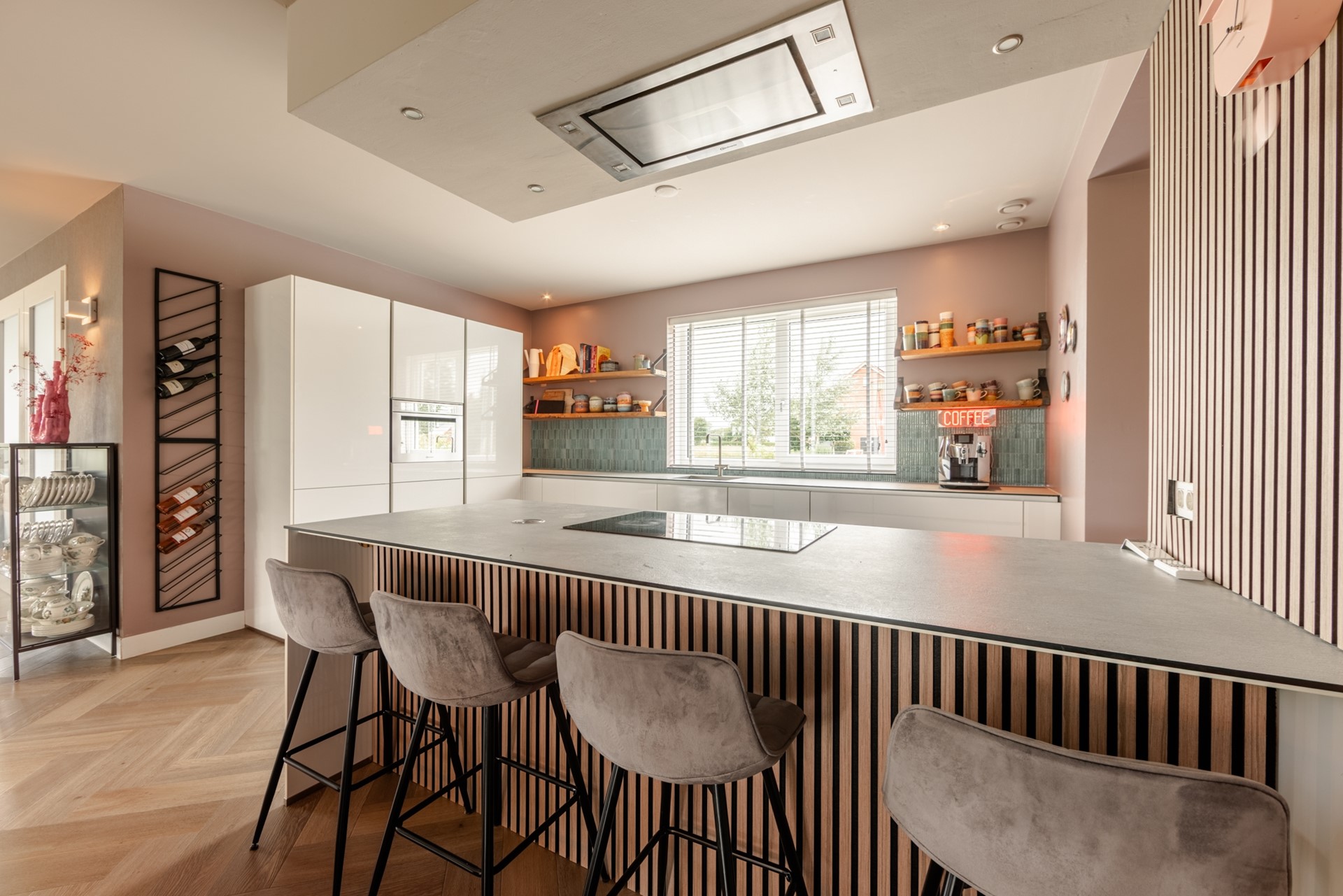 De moderne, luxe halfopen woonkeuken is voorzien van diverse inbouwapparatuur. Daarnaast is er een bijkeuken met een aansluiting voor de wasmachine.