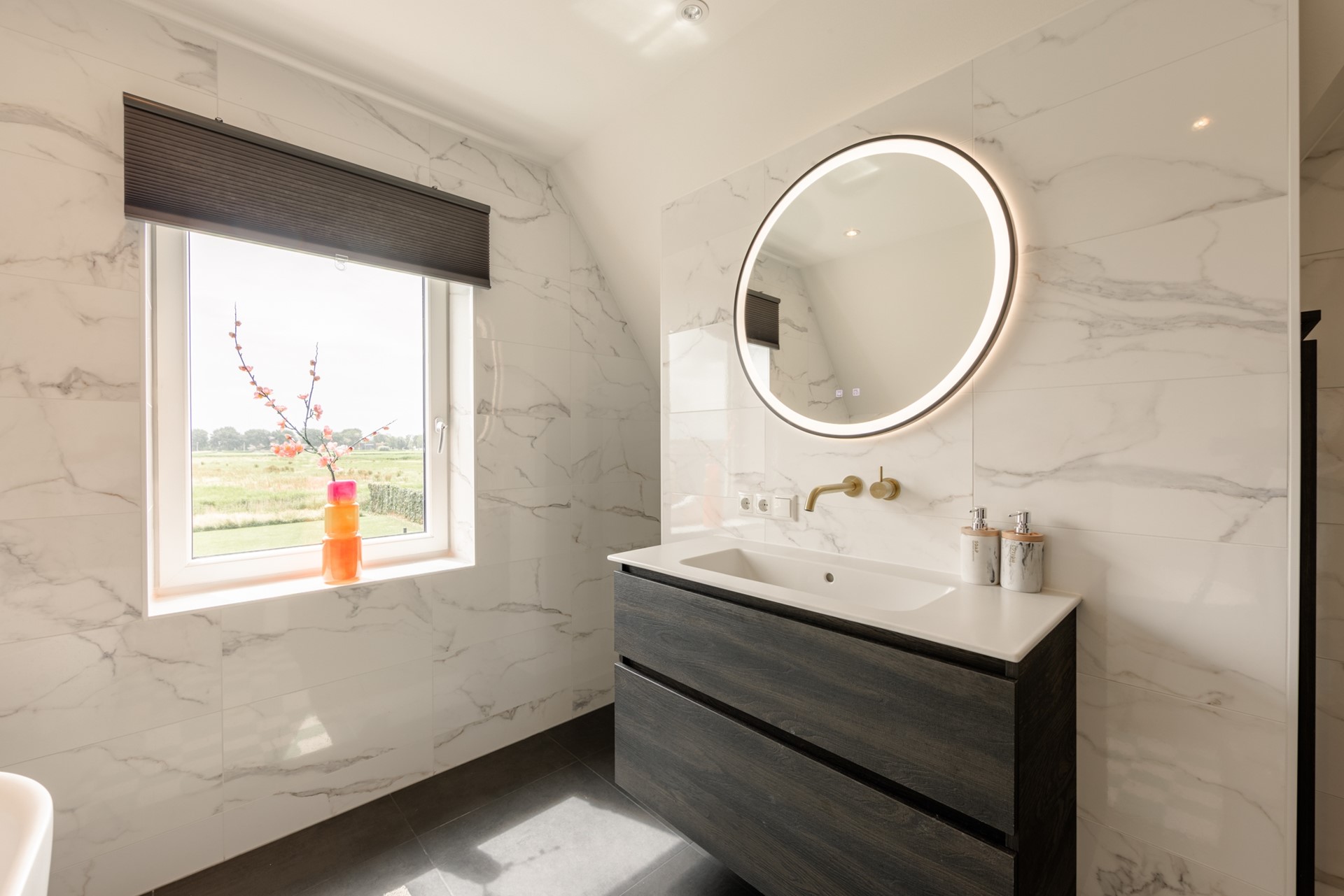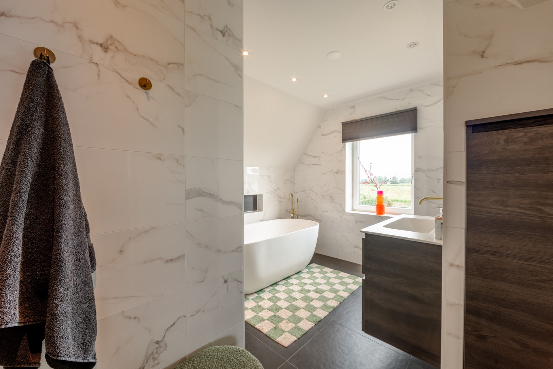 Op de eerste verdieping vind je een royale overloop met toegang tot de badkamer, voorzien van een inloopdouche, dubbele wastafel en vloerverwarming. Er zijn drie slaapkamers, waarvan één met een kleedkamer en een tweede badkamer met ligbad, inloopdouche, wastafelmeubel en ook vloerverwarming.