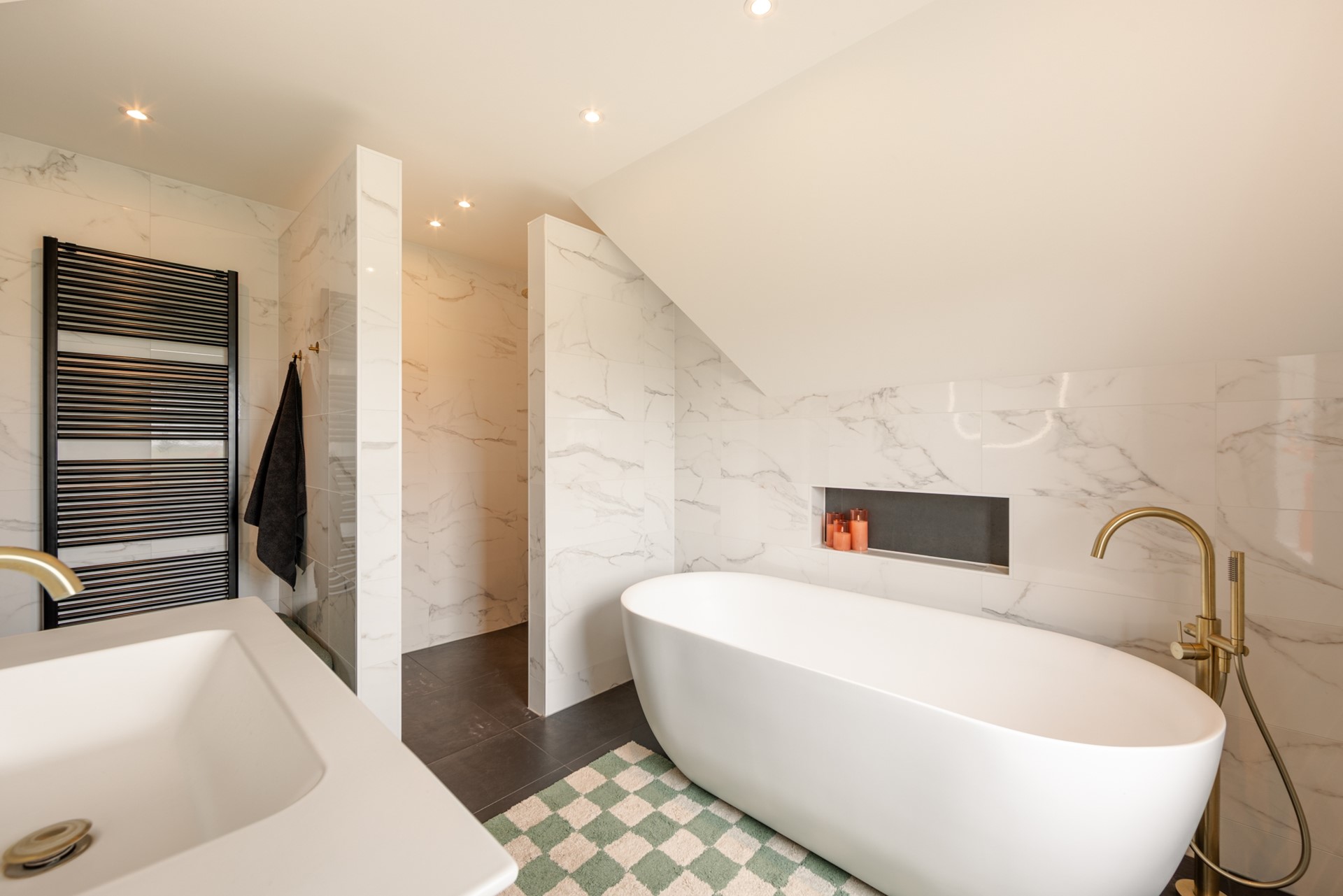 | Badkamervoorzieningen Badkamer 1 | Dubbele wastafel, Inloopdouche, Vloerverwarming |