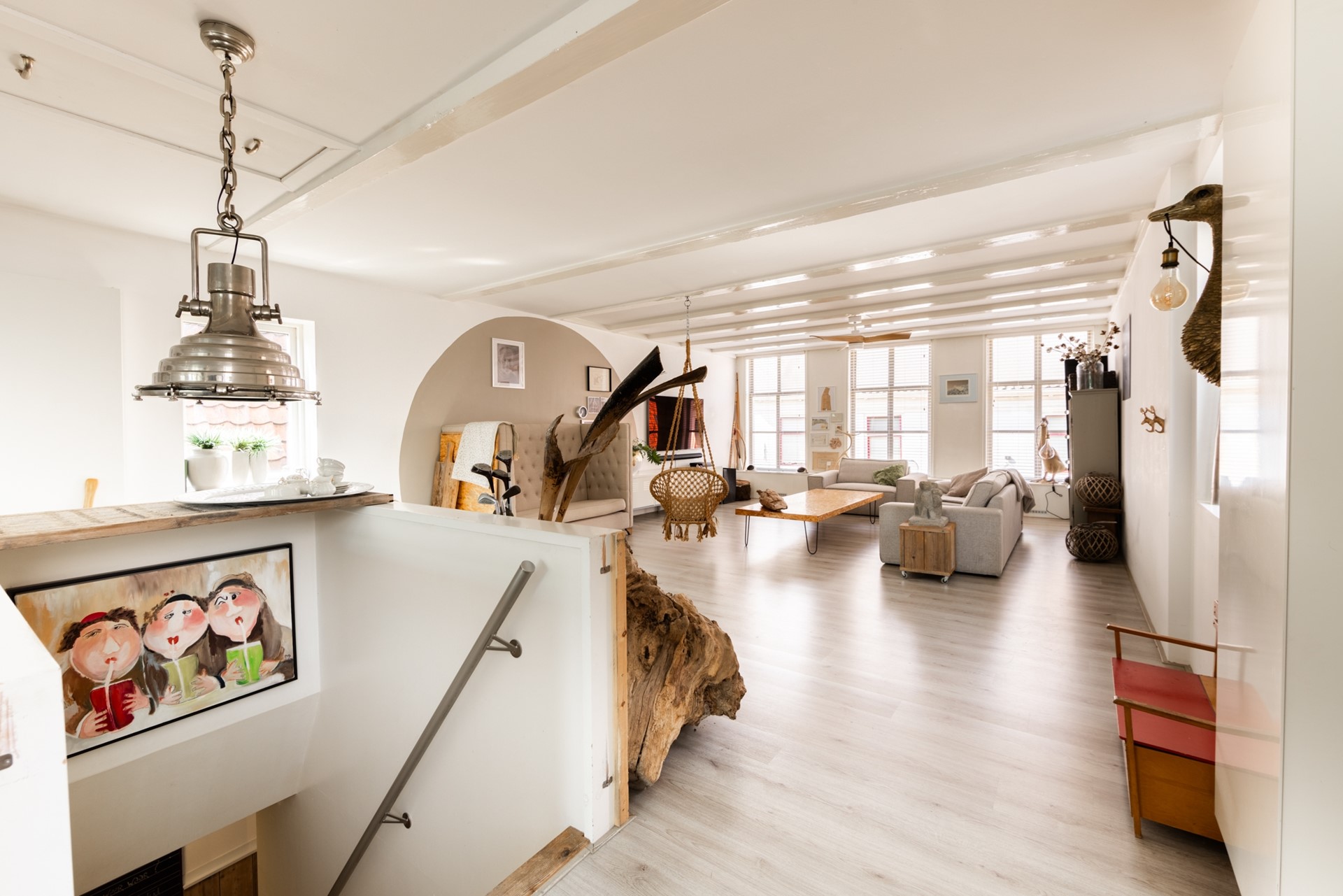 Via de lange gang kom je bij vier kamers. De woning heeft een gemengde bestemming, waardoor je beneden bijvoorbeeld ook een winkel, praktijk of kantoor kunt beginnen. In de slaapkamers moet je echt een wekker zetten, want het is er heerlijk rustig. Hier kun je een gat in de dag slapen.