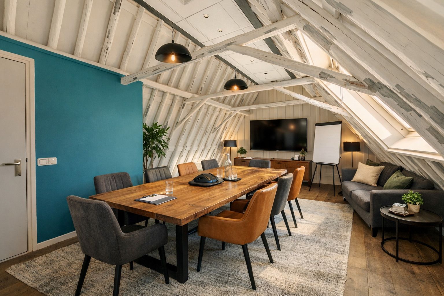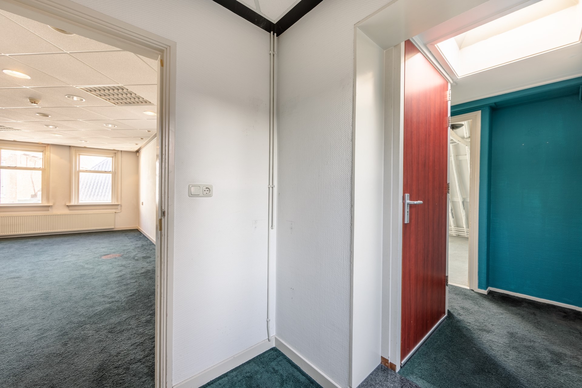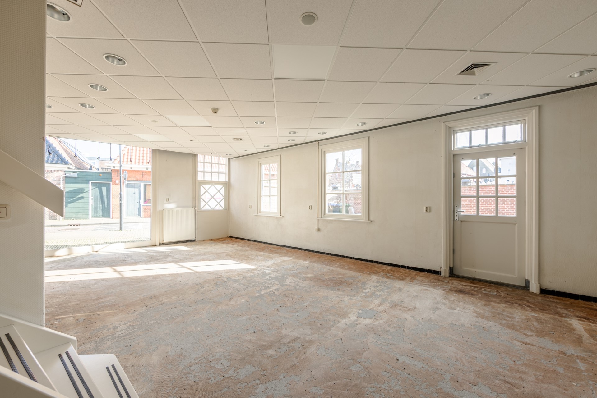 Op de eerste verdieping is nu de woonkamer met de halfopen keuken. Dat is vroeger ook kantoorruimte geweest. Via een doorloop, met een deur naar het terrasje op het westen, kom je in een ruimte die voorheen als vergaderruimte werd gebruikt, maar die ook prima als slaapkamer kan dienen.