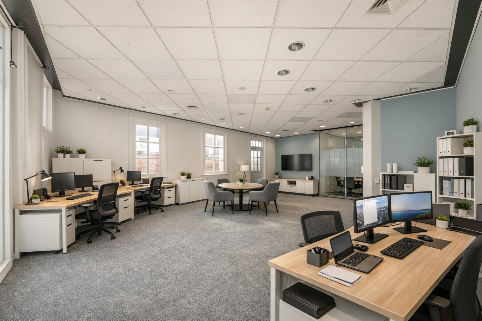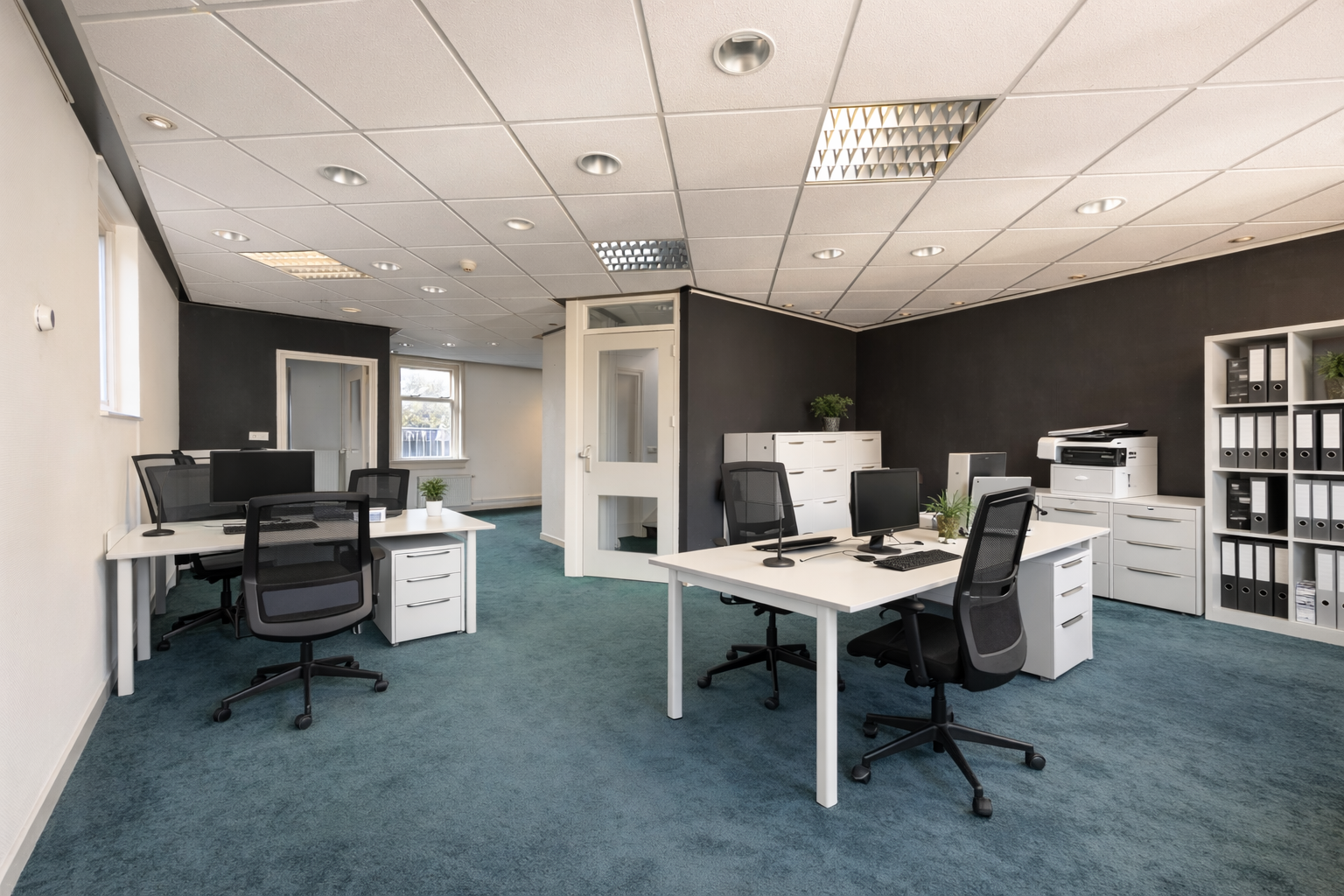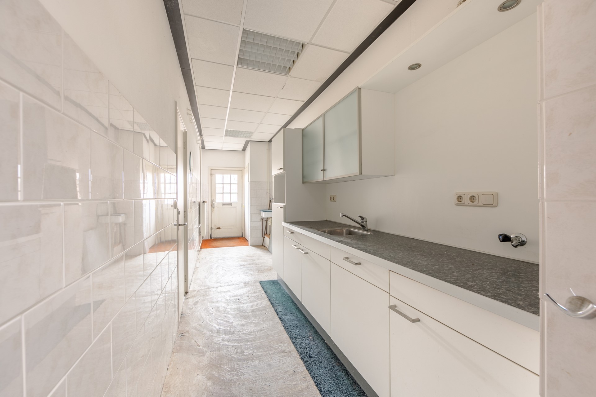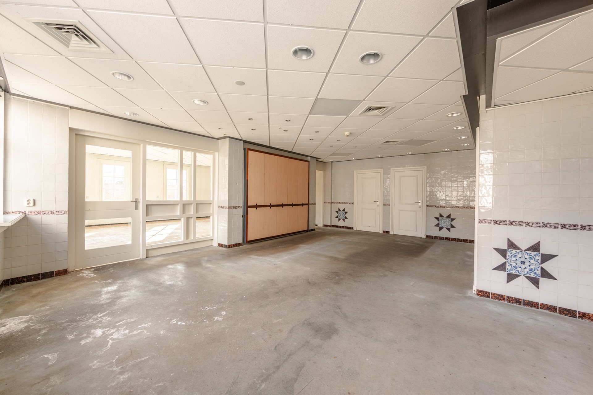 Op de eerste verdieping is nu de woonkamer met de halfopen keuken. Dat is vroeger ook kantoorruimte geweest. Via een doorloop, met een deur naar het terrasje op het westen, kom je in een ruimte die voorheen als vergaderruimte werd gebruikt, maar die ook prima als slaapkamer kan dienen.