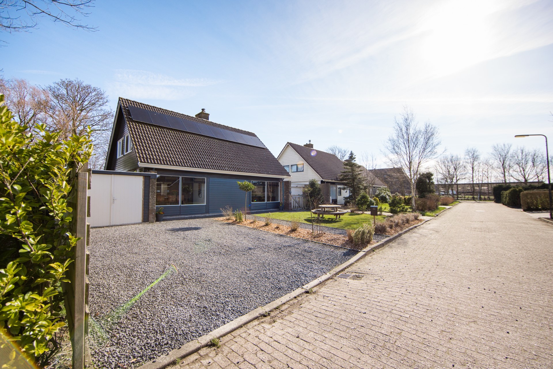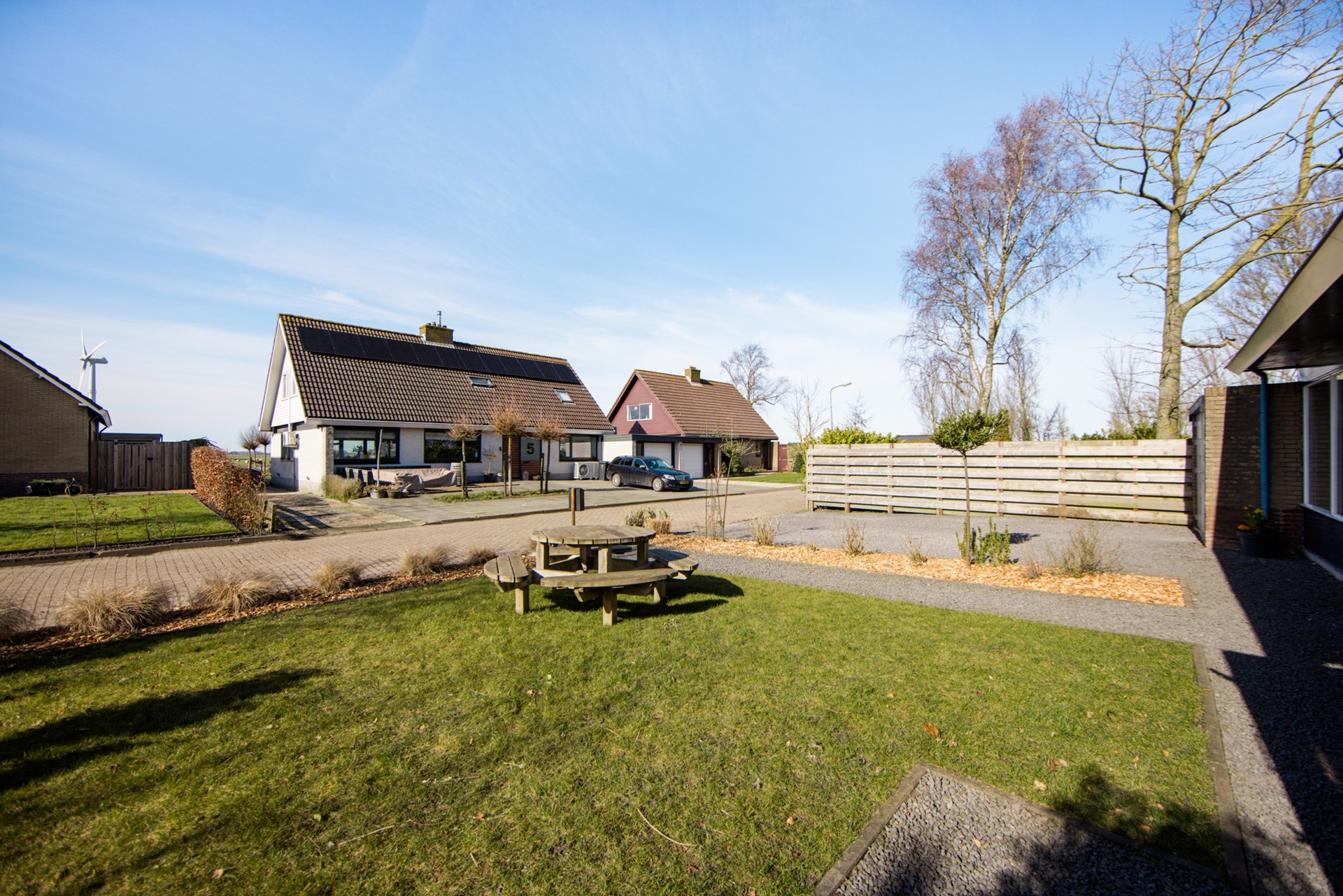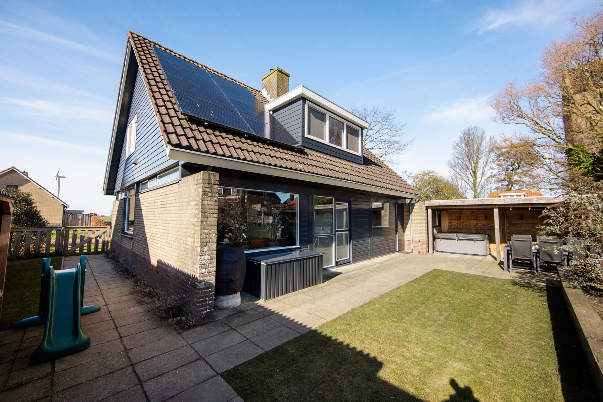 Wat gelijk opvalt aan de voorzijde is de enorme voortuin. 10 meter diep en 17 meter breed. Met een ruime oprit naar de garage, waar je wel twee auto’s kunt parkeren. Op het dak liggen 18 zonnepanelen. Ook aan de achterzijde heb je een beschutte tuin van wel 17 meter breed, heerlijk op de zon. Met een overkapping en een prachtig ruim uitzicht.