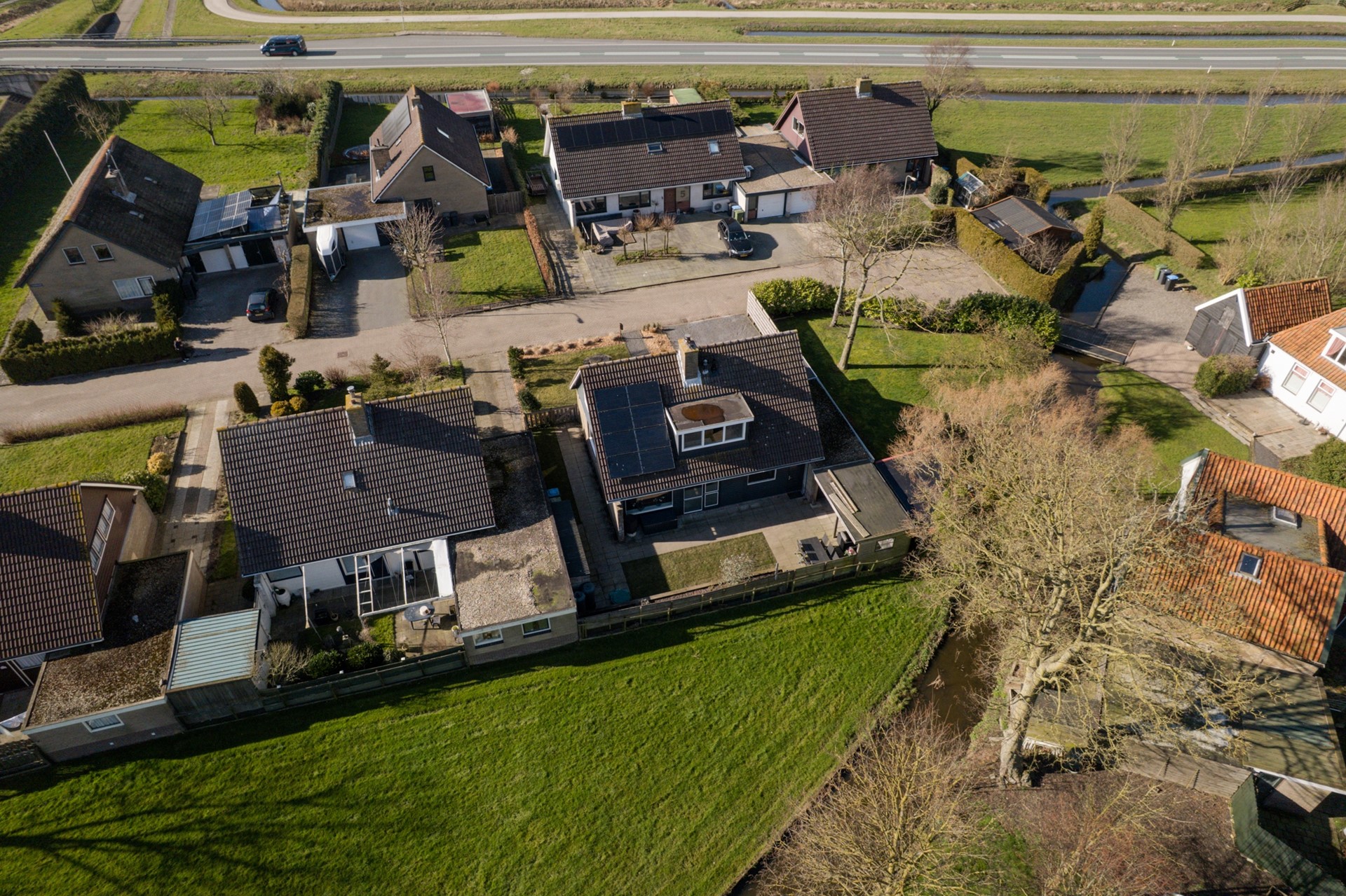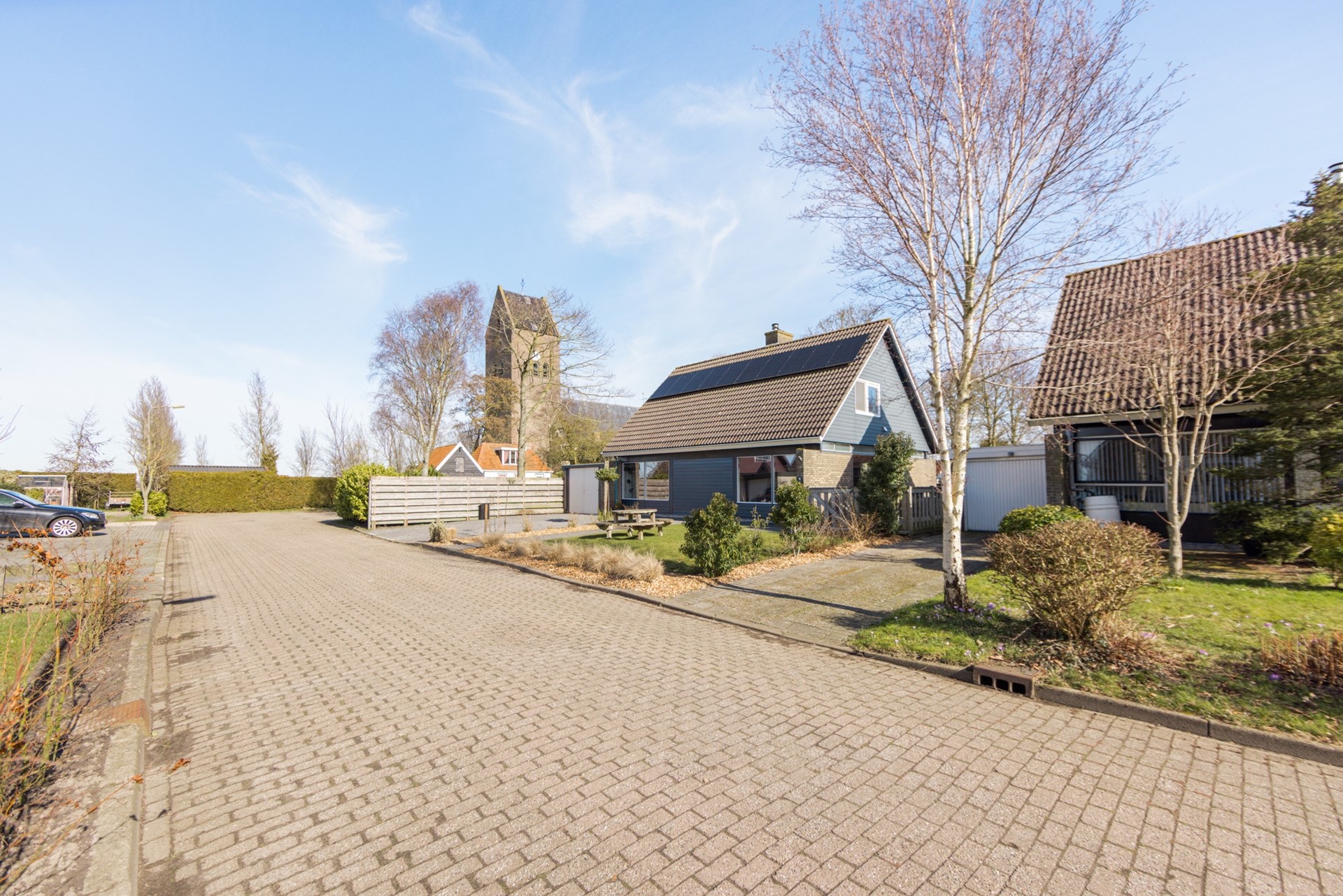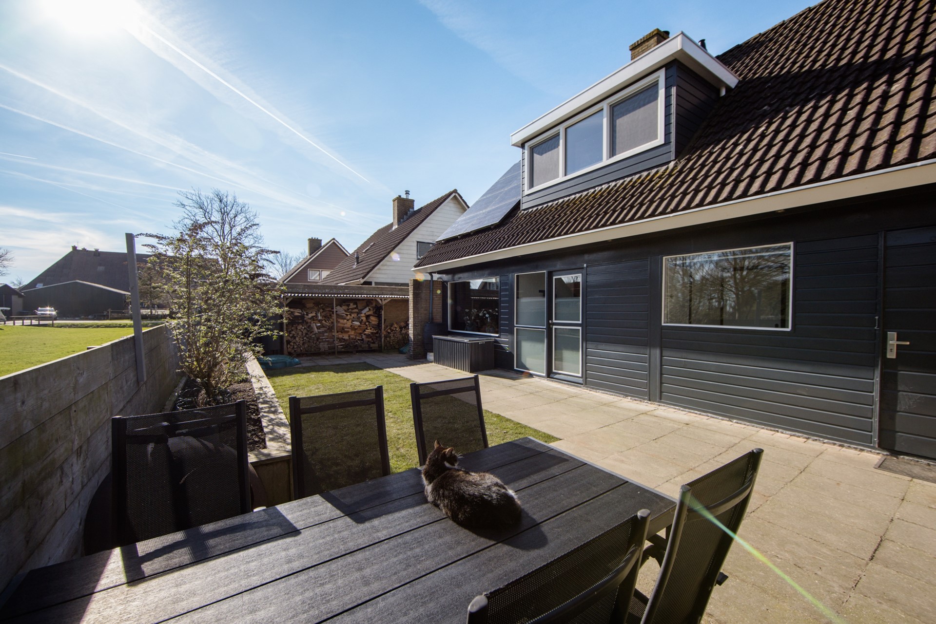 Wat gelijk opvalt aan de voorzijde is de enorme voortuin. 10 meter diep en 17 meter breed. Met een ruime oprit naar de garage, waar je wel twee auto’s kunt parkeren. Op het dak liggen 18 zonnepanelen. Ook aan de achterzijde heb je een beschutte tuin van wel 17 meter breed, heerlijk op de zon. Met een overkapping en een prachtig ruim uitzicht.