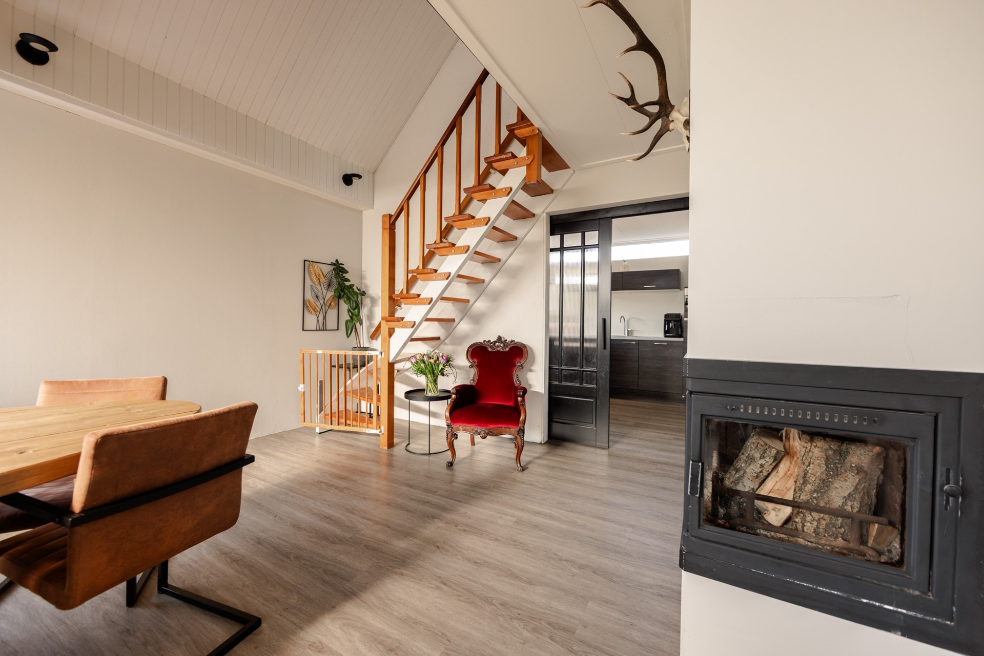 Via de hal met de bijkeuken kom je in de vernieuwde halfopen keuken met inbouwapparatuur. De L-vormige woonkamer heeft een sfeervolle houtkachel en HR++ dubbel glas. Ook boven is alles voorzien van dubbel glas en zijn de wanden geïsoleerd.