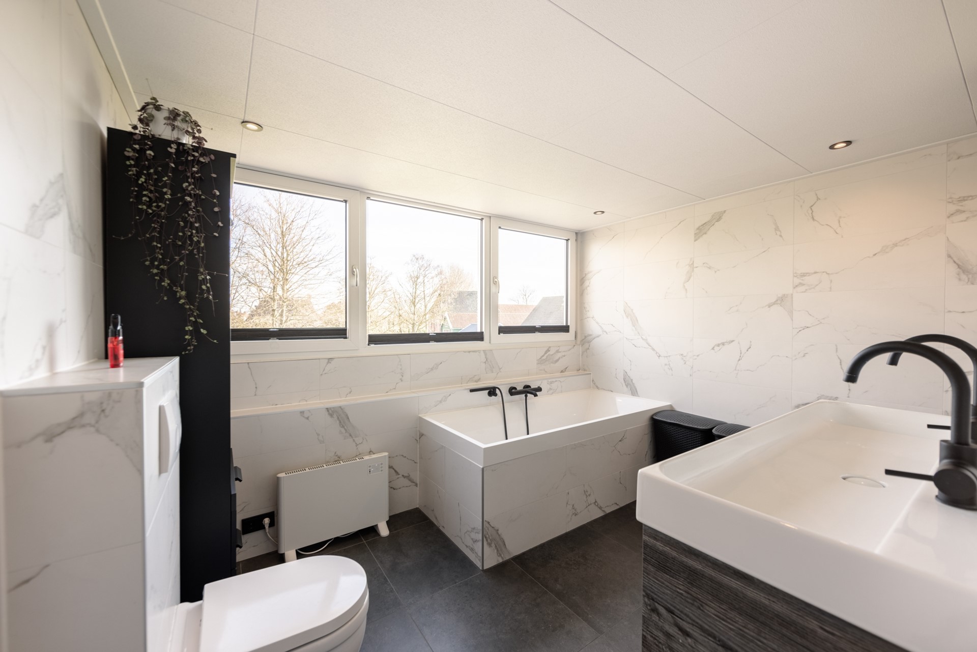 | Badkamervoorzieningen | Dubbele wastafel, Inloopdouche, Ligbad, Toilet, Wastafelmeubel |